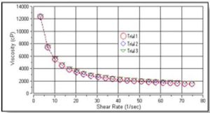 Hình 2 xác nhận hiện tượng shear-thinning và cho thấy kết quả có độ lặp lại cao trong dải tốc độ cắt đã thử nghiệm.